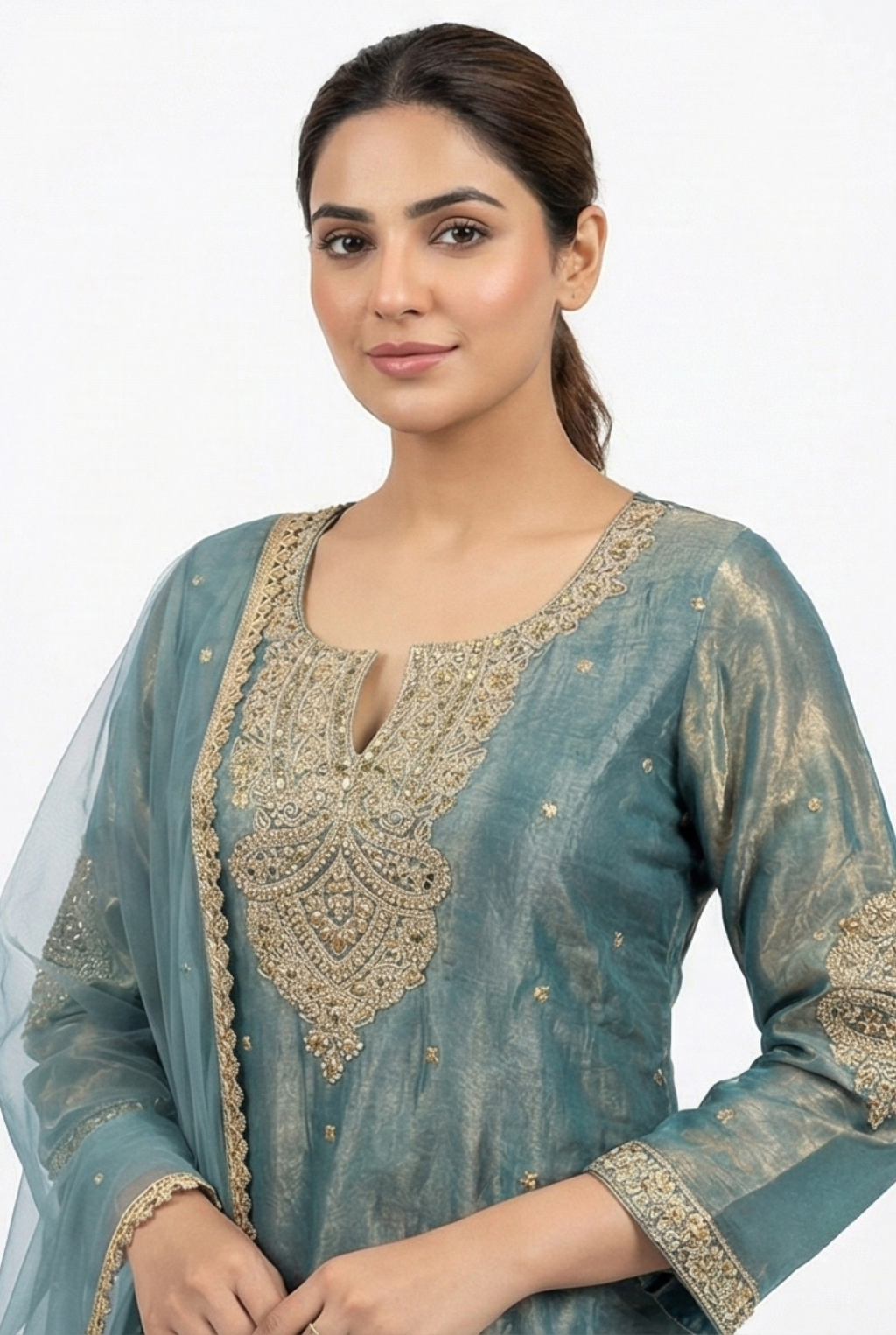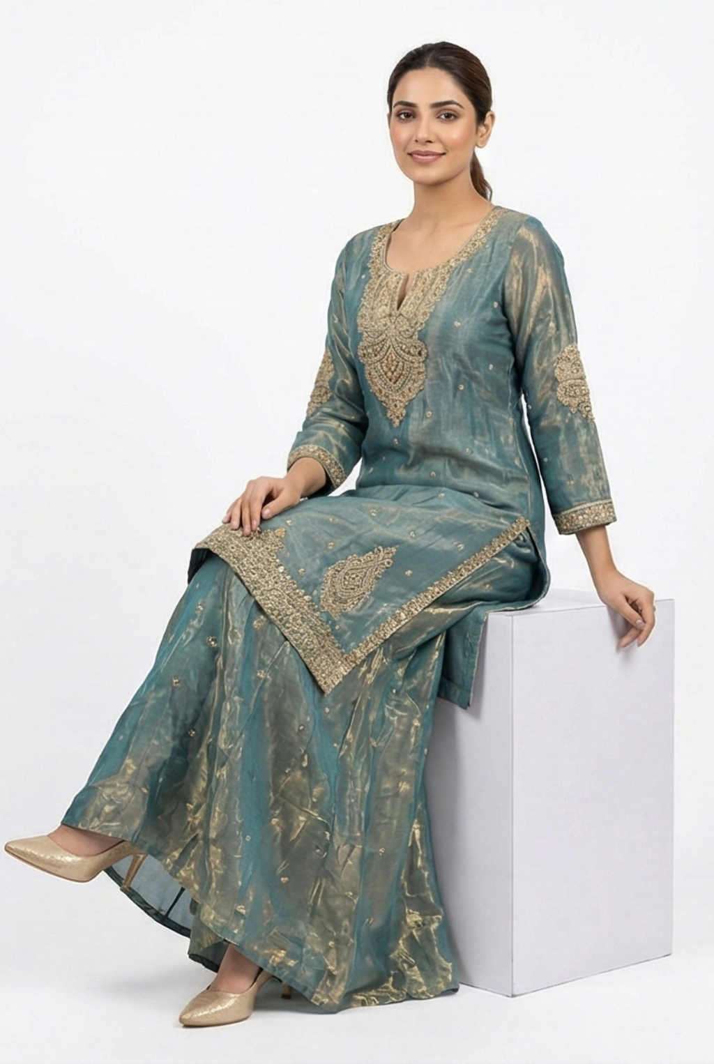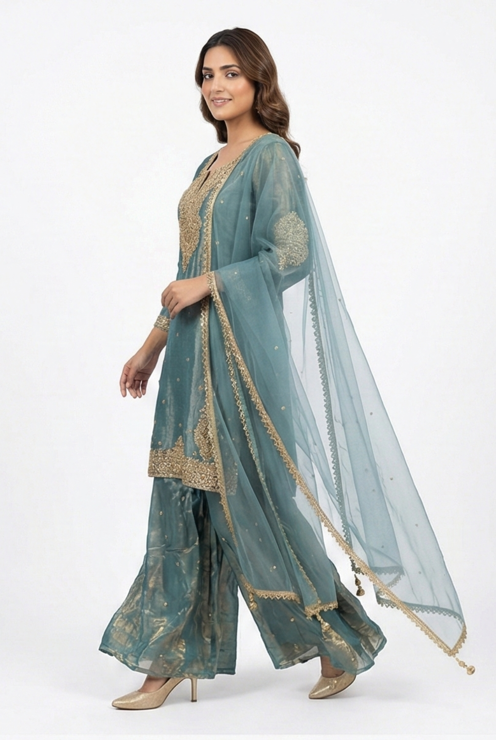 Exude timeless elegance with this Regal Teal Sharara Set, crafted from lustrous tissue silk fabric that offers a rich, metallic sheen. The short kurta features intricate gold Zari embroidery on the yoke and hem, perfectly complemented by the volumetric, crinkled sharara bottoms with woven gold accents. Finished with a sheer organza net dupatta, this ensemble offers lightweight comfort and sophisticated style, making it an ideal choice for festive gatherings and wedding receptions.